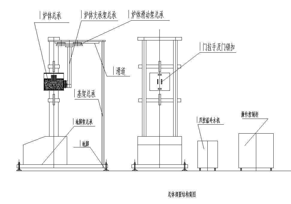 1)高溫爐體 為了讓用戶方便安全的更換試樣,采用水冷、可移動、對開式的爐體結(jié)構(gòu)(具體見簡圖1).爐體及爐蓋采用雙層不銹鋼的焊接結(jié)構(gòu),總厚度約為15mm,中空通流動水。具有開門斷電功能。